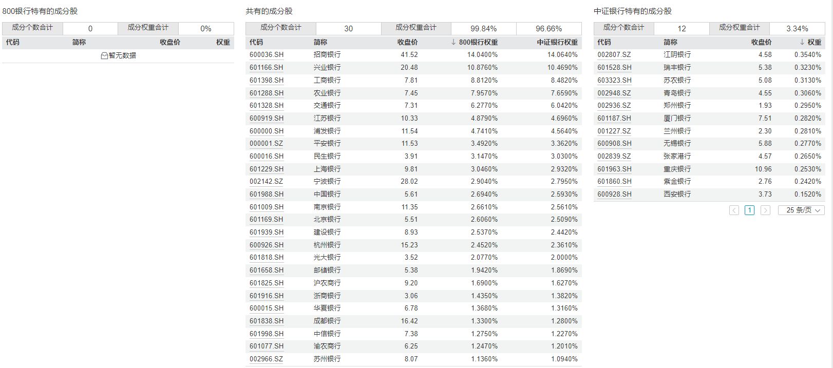 进一步对比两个指数的成分股,可以看到两个指数共有的成分股是 30 只,也就是说,中证银行指数的成分股完全包含了中证 800 银行指数的成分股,同时中证银行指数还有 12 只独有的成分股,如江阴银行、瑞丰银行等。