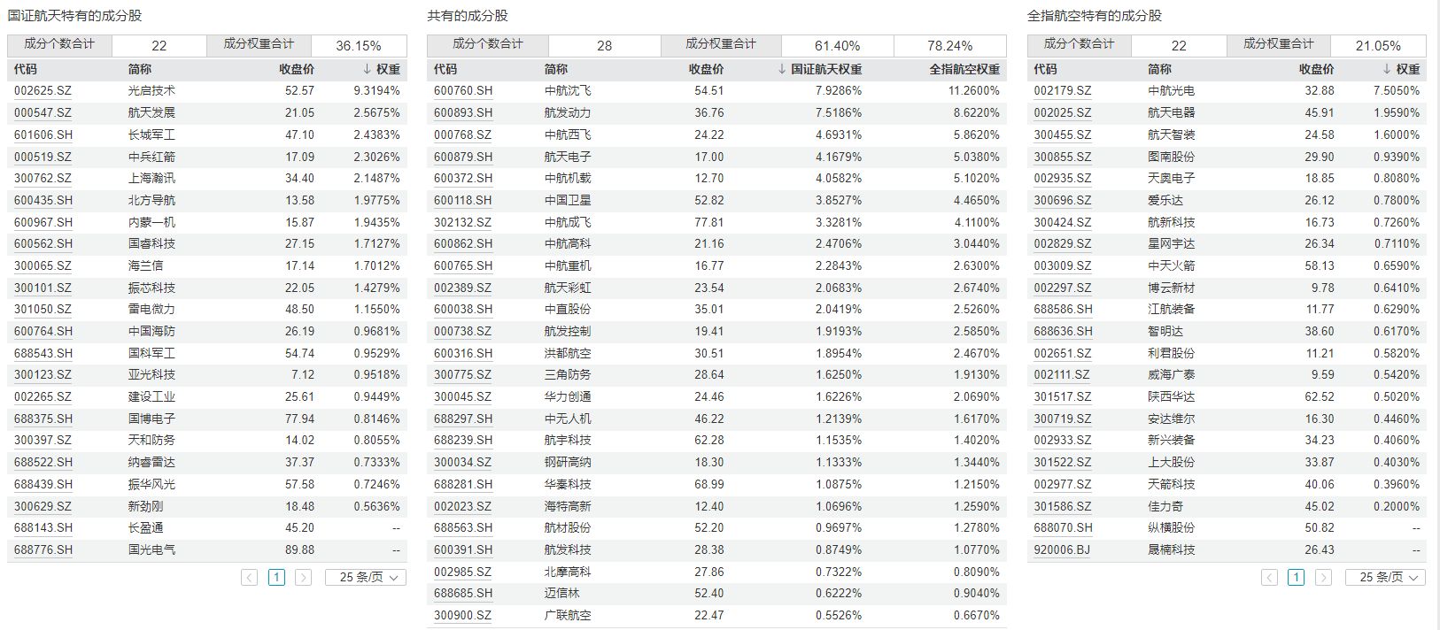 进一步对比两个指数的成分股,可以发现两个指数共有的成分股是 28 只,各自独有的成分股是 22 只。其中,国证航天航空行业指数独有的成分股包括光启技术、航天发展、长城军工等,中证全指航空航天指数独有的成分股包括中航光电、航天电器、航天智装等。