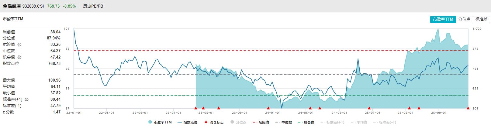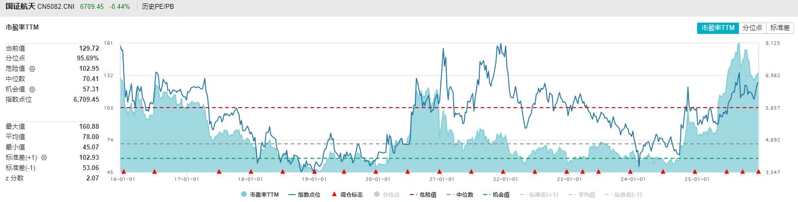 接着看两个指数目前的估值水平,Wind 数据显示,国证航天航空行业指数目前的市盈率 TTM 回升到了近十年 90% 分位以上,属于较高位置。中证全指航空航天指数目前的市盈率 TTM 也回升到接近 90% 的分位,不过中证全指航空航天指数过往的历史数据较短,还不足 5 年,因此只能够代表近几年的水平。