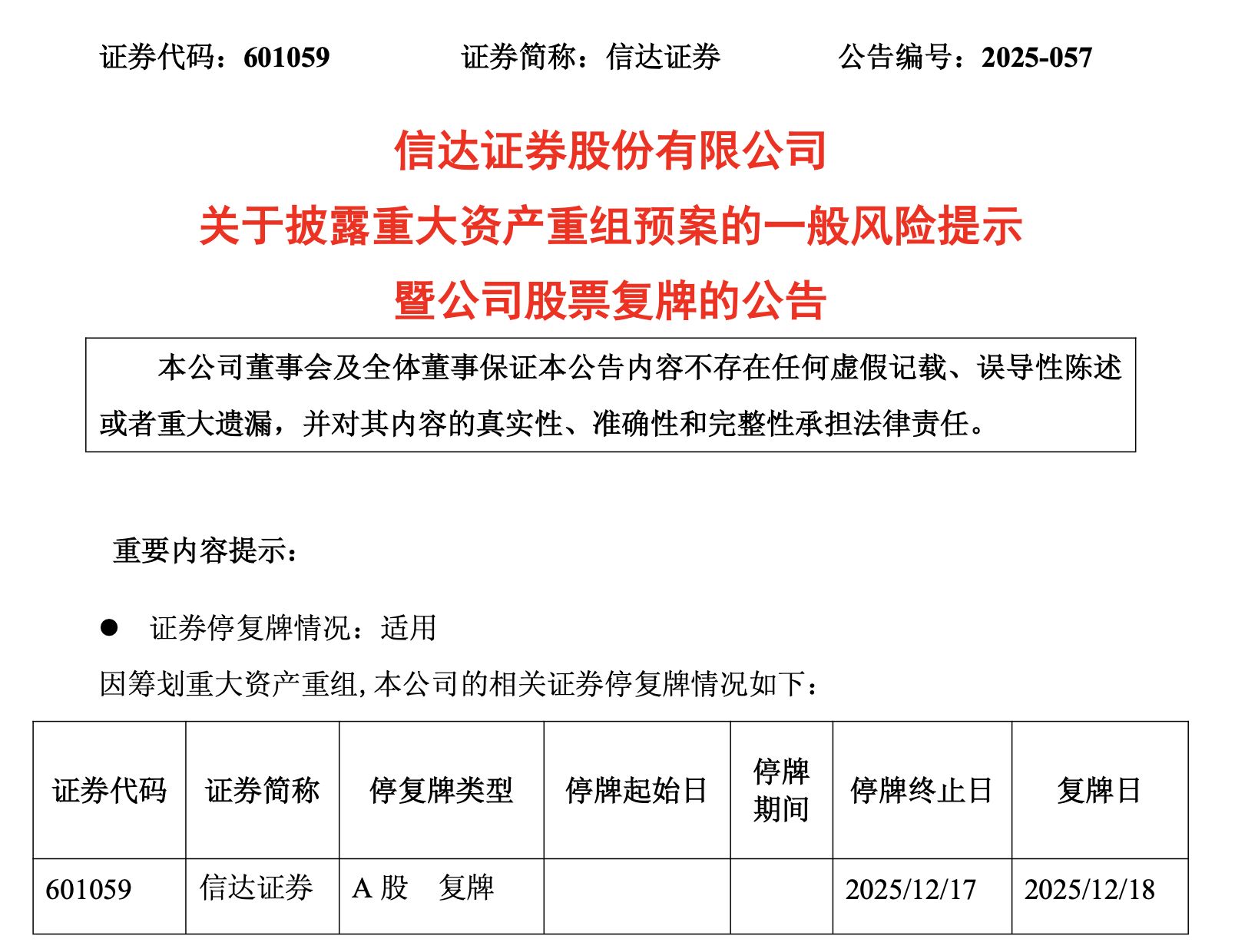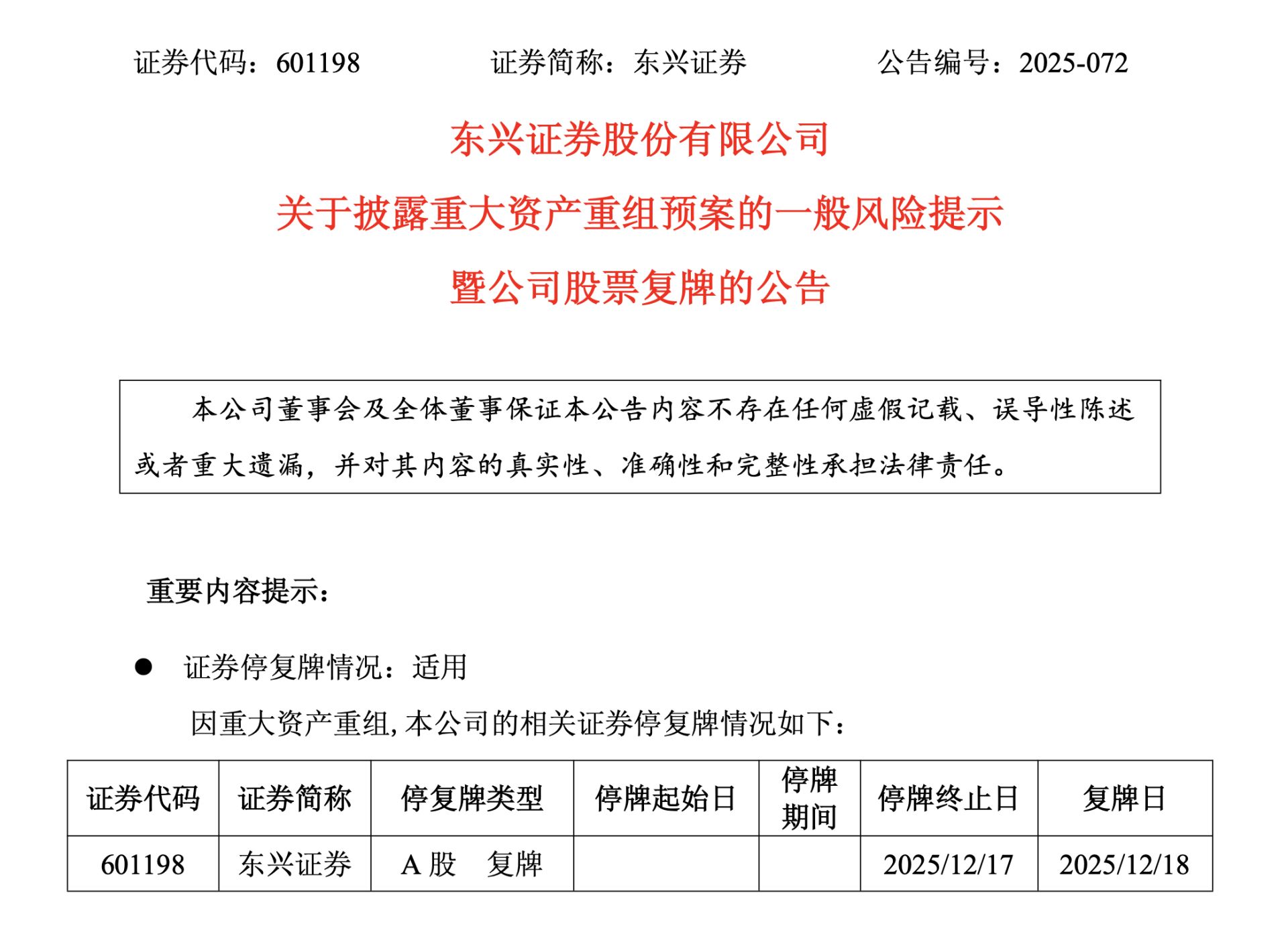 另外,东兴证券、信达证券也同日公告称,于 2025 年 12 月 18 日开市起复牌。