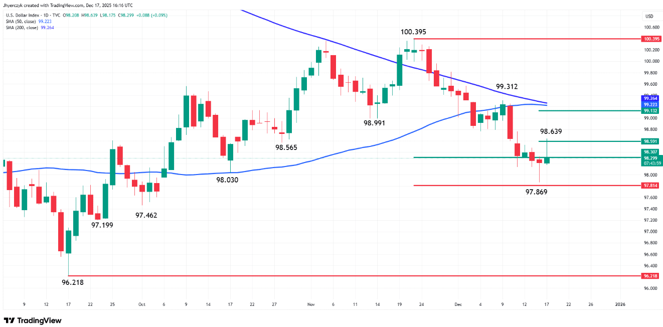 Fxempire 分析称,美元面临劳动力市场持续疲软以及美联储可能在 2026 年初进行鸽派政策调整带来的阻力。随着位于 99.264 的 200 日移动均线即将下穿位于 99.222 的 50 日移动均线形成 「死叉」,交易员正为周四发布的 11 月 CPI 数据可能引发的市场波动做好准备。