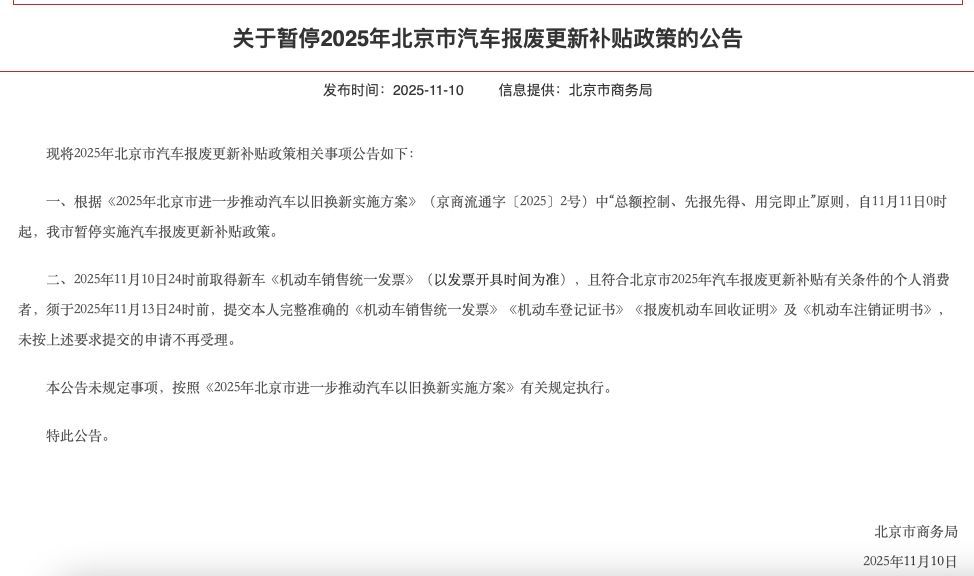 11 月 12 日,北京市商务局发布 《关于暂停 2025 年北京市汽车报废更新补贴政策的公告》 称,根据 「总额控制、先报先得、用完即止」 原则,自 11 月 11 日 0 时起,北京市暂停实施汽车报废更新补贴政策。「北京市已经暂停的地方补贴和明年执行的新能源汽车车辆购置税减半征收的金额其实差不多。」 一位蔚来中心 (东方广场) 销售人员对记者说。