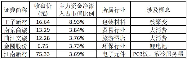 主力资金净流入金额占市值比例排名前 5 的个股分别为王子新材、南京商旅、曲江文旅、金圆股份、江南新材。欢迎大家关注微信公众号 「道达号」,其 「道达涨停复盘」 栏目为大家解读。