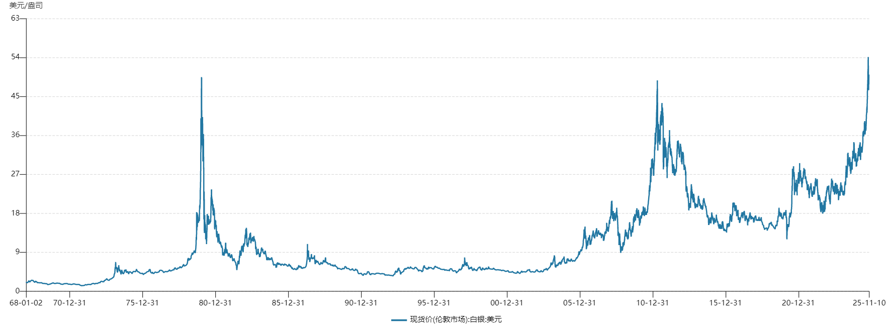 结合宏观经济、货币政策与产业需求等核心驱动因素,过去 60 年即 1965—2025 年国际白银期货行情可划分为 「低位蛰伏—操纵暴涨—熊市调整—量化驱动—供需共振」 五个阶段,呈现工业属性与金融属性交替主导、价格波动剧烈的特征,具体回顾如下: