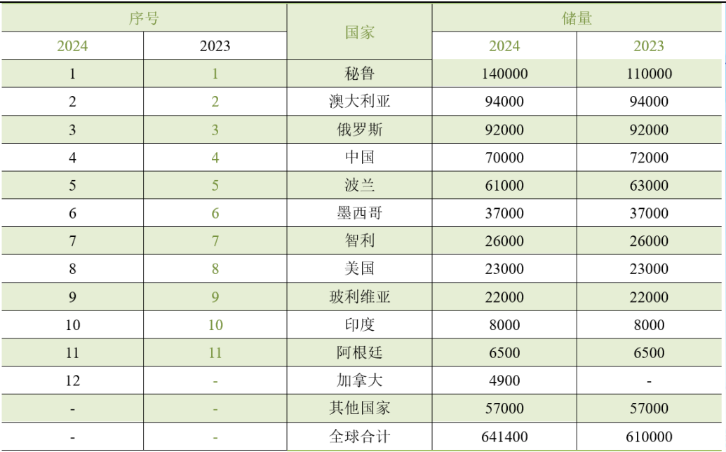 2023—2024 年全球白银分国别储量及排名 (单位:吨)