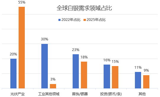 2025 年与 2022 年全球白银下游需求领域占比情况