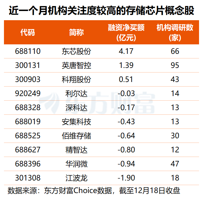 值得注意的是,上述机构高度关注的概念股中,东芯股份、英唐智控、科翔股份还获得了融资客的青睐,近一个月,这 3 股分别获融资净买入 4.17 亿元、1.39 亿元和 5137.38 万元。