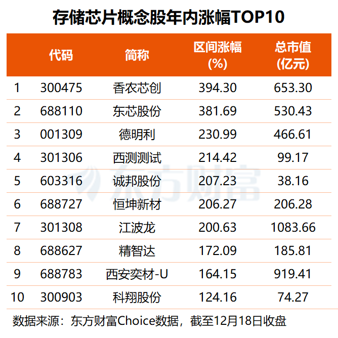 存储芯片板块指数今年累涨逾五成,近九成概念股实现股价上涨,平均涨幅约 59.78%,更有 18 股翻倍式增长。其中,香农芯创年内大涨近 4 倍,东芯股份累涨 3.81 倍,德明利、西测测试、江波龙等 5 股年内涨幅均超 200%。