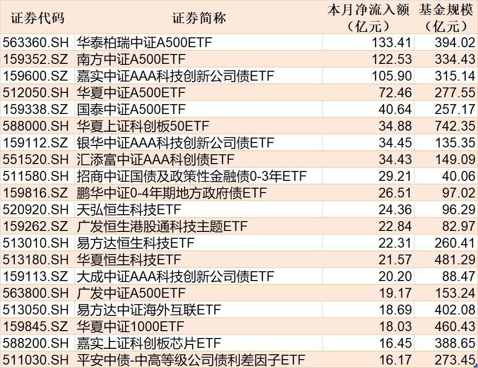 Wind 数据显示,在 12 月 18 日的非货币 ETF 市场中,易方达创业板 ETF 基金份额增加 6.22 亿份,净流入额 19.36 亿元;嘉实中证 AAA 科技创新公司债 ETF 份额增加 0.19 亿份,净流入额 19.15 亿元;华泰柏瑞中证 A500ETF 份额增加 15.09 亿份,净流入额 18.54 亿元。