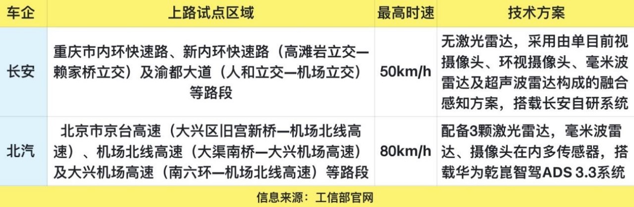 根据工信部公示信息,长安汽车和北汽极狐各有一款车型获得有条件自动驾驶许可。其中,长安获批车型可在重庆市内特定快速路段,以最高 50km/h 的车速,在拥堵环境中实现高速公路与城市快速路的单车道自动驾驶;北汽极狐获批车型则可在北京市多个指定路段,以最高 80km/h 的车速,实现同类功能。记者从两家车企方面获悉,此次获批具体车型为 「深蓝 SL03」 和 「极狐阿尔法 S6(L3) 版」。