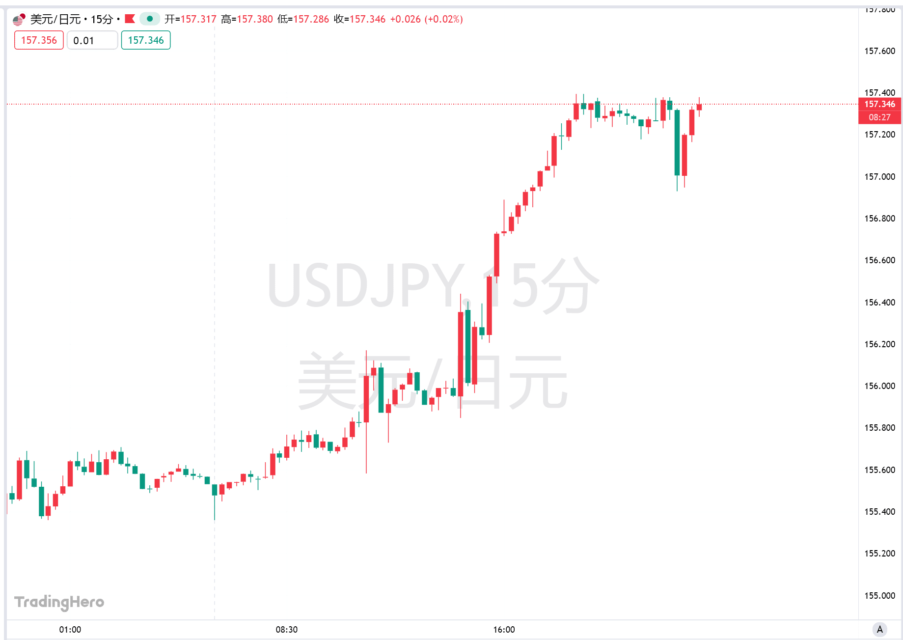 美元兑日元在 157 关口上方持续走高,有望创下 10 月初以来的最大单日涨幅,同时也是近 1 个月来的最高水平。欧元兑日元触及纪录新高,日内上涨 1.2%。