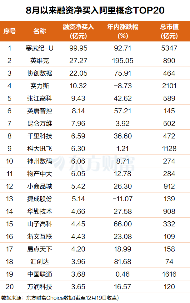 东方财富Choice 数据显示,自今年 8 月以来,杠杆资金抢筹了一批阿里概念股,融资净买入前 20 个股合计金额近 250 亿元。