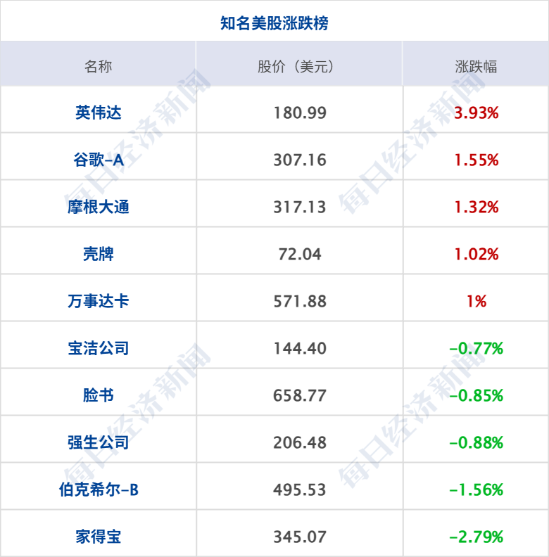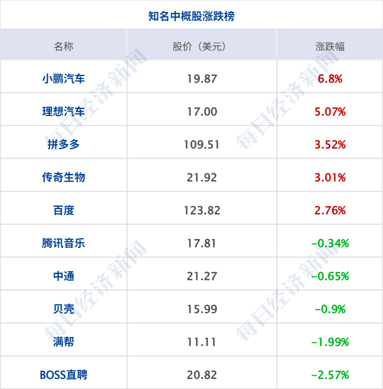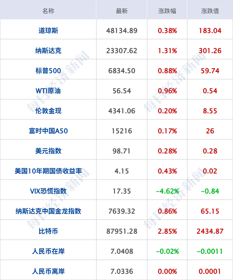美股三大指数集体收涨,道指涨 0.38%,纳指涨 1.31%,标普 500 指数涨 0.88%;大型科技股普涨,英伟达涨近 4%,博通涨超 3%,谷歌涨超 1%;加密矿企、半导体、金属与采矿涨幅居前,美国黄金公司涨超 11%,Hut 8 涨超 14%,世纪铝业涨超 7%,美光科技、AMD、Circle 涨超 6%,超微电脑涨超 5%,美洲白银公司涨近 4%,戴尔科技、Coinbase 涨超 2%;多元保险、鞋服、房地产开发跌幅居前,耐克跌超 10%,伯克希尔跌超 1%。纳斯达克中国金龙指数涨 0.86%,中概股多数上涨,小鹏汽车涨超 6%,理想汽车涨超 5%,拼多多涨超 3%,百度、知乎涨超 2%,爱奇艺跌超 1%。