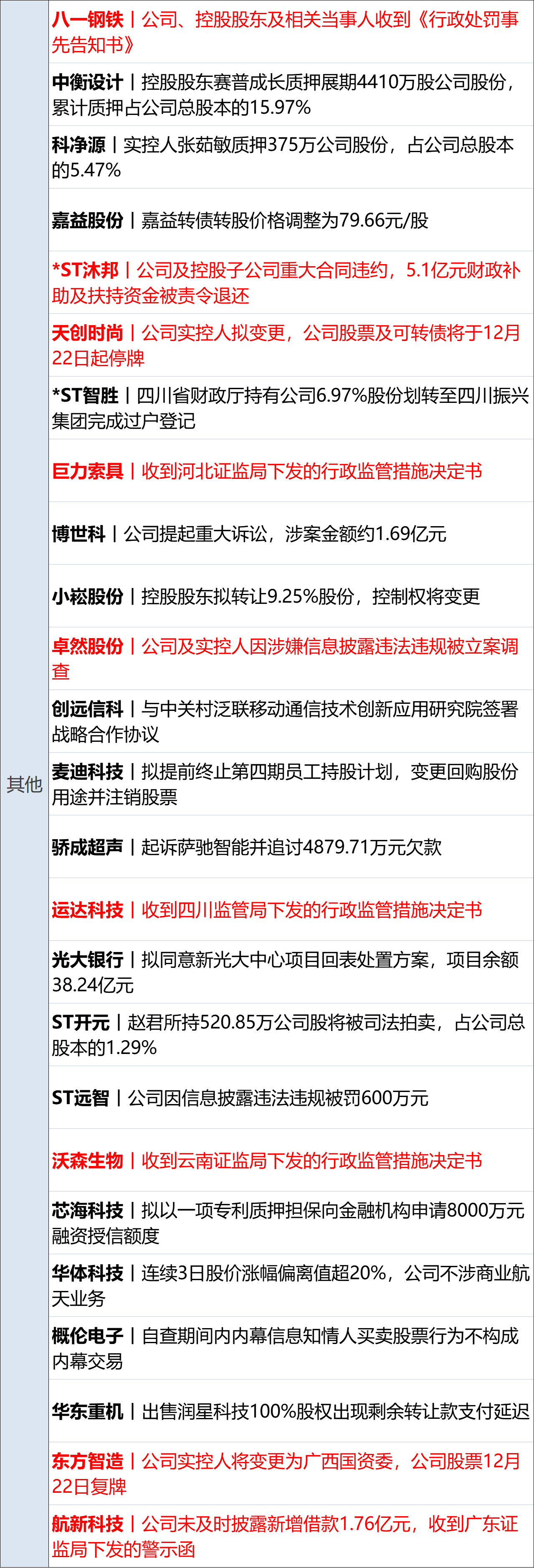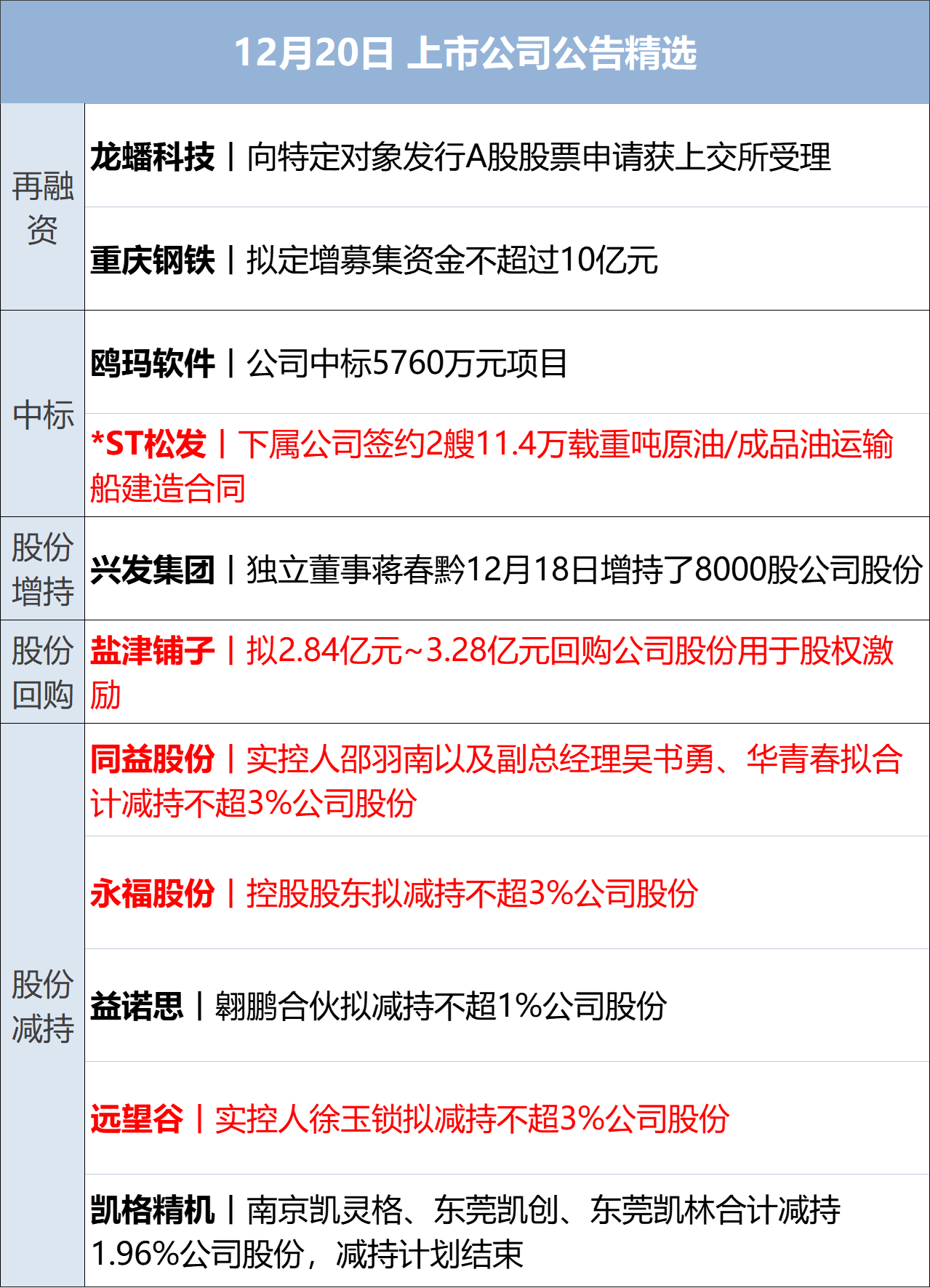 春风动力(SH603129,股价 297.21 元,市值 453.48 亿元):12 月 19 日,春风动力发布公告称,公司近期接到通信运营商通知,2G 网络将于 2026 年内全面停止服务。随着 2G 逐步退网,所有搭载一代 (2G)T-BOX 车辆的智能网联服务将面临中断风险。公司将启动针对一代 (2G)T-BOX 车辆的服务保障计划:即日起,CFMOTO APP 已关闭一代 (2G)T-BOX 车辆智能网联充值功能,避免产生后续费用;所有当前处于智能网联服务付费期内的一代 (2G)T-BOX 用户,CFMOTO APP 将于 2026 年 1 月 1 日前自动发起余额退费,原路退回至原始支付账户。此外,自 2026 年 1 月 1 日起,车主也可致电所在地授权门店预约更换二代 (4G)T-BOX 服务。