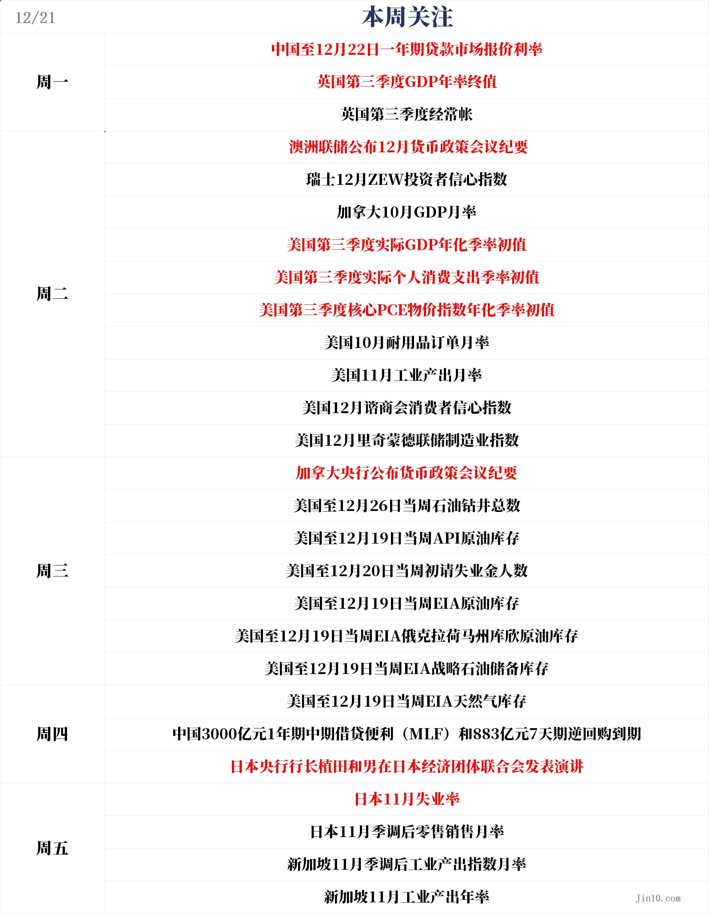 周一 09:00,中国至 12 月 22 日一年期贷款市场报价利率;