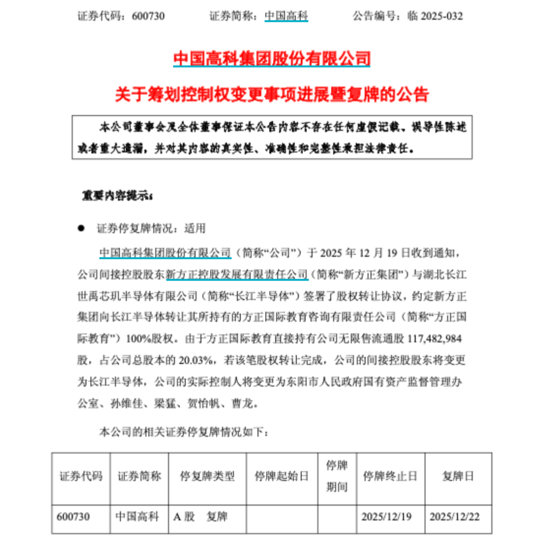 同日,中国高科也发布公告称,公司于 2025 年 12 月 19 日收到通知,公司间接控股股东新方正控股发展有限责任公司 (简称 「新方正集团」) 与湖北长江世禹芯玑半导体有限公司 (简称 「长江半导体」) 签署了股权转让协议,约定新方正集团向长江半导体转让其所持有的方正国际教育咨询有限责任公司 (简称 「方正国际教育」)100% 股权。由于方正国际教育直接持有公司无限售流通股约 1.17 亿股,占公司总股本的 20.03%,若该笔股权转让完成,公司的间接控股股东将变更为长江半导体,公司的实际控制人将变更为东阳市人民政府国有资产监督管理办公室、孙维佳、梁猛、贺怡帆、曹龙。