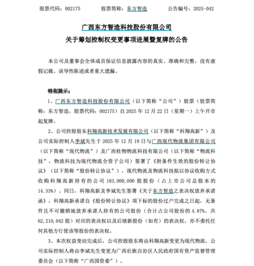东方智造公告显示,公司控股股东科翔高新技术发展有限公司 (以下简称 「科翔高新」) 及公司实际控制人李斌先生于 2025 年 12 月 19 日与广西现代物流集团有限公司 (以下简称 「现代物流」) 及广西桂物物流科技有限公司 (以下简称 「物流科技」,物流科技为现代物流全资子公司) 签署了 《附条件生效的股份转让协议》(以下简称 「股份转让协议」),现代物流及物流科技拟以协议收购方式收购科翔高新持有的公司 1.83 亿股股份 (占上市公司总股本的 14.33%)。同日,科翔高新及李斌先生签署 《关于东方智造之表决权放弃承诺函》,科翔高新承诺自 《股份转让协议》 项下标的股份过户完成之日起,无条件且不可撤销地放弃承诺人持有的公司股份 (合计占公司股份的 4.87%,共约 6221 万股) 对应的表决权以及后续新股份 (如有) 的表决权,亦不委托任何其他方行使该等股份的表决权。