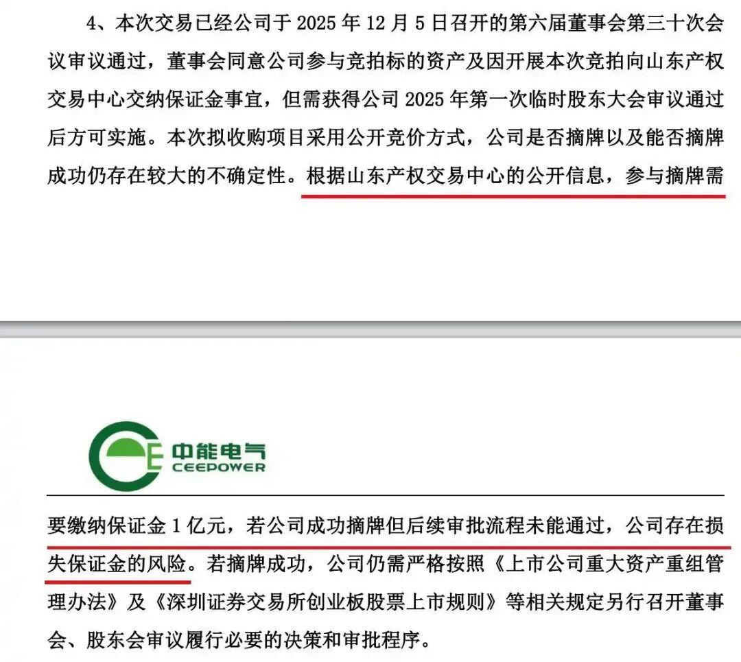 值得注意的是,真正引发争议的是支付流程。中能电气表示,根据山东产权交易中心公开信息,参与摘牌需缴纳保证金 1 亿元,若中能电气成功摘牌但后续审批流程未能通过,存在损失保证金的风险。