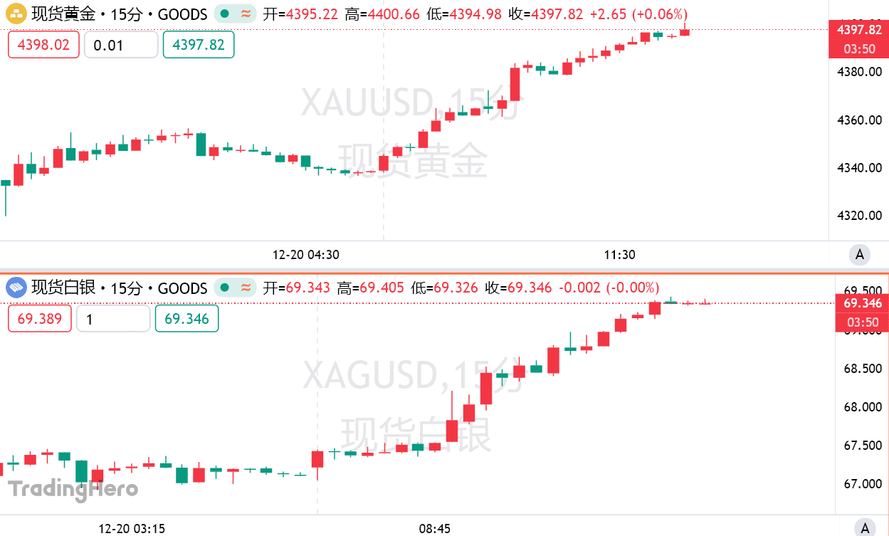 现货黄金价格逼近 4400 美元,再度刷新历史新高;白银一度涨超 2%,将历史新高刷新至 69 美元上方;铂金自 2008 年以来首次升破 2000 美元/盎司,今年累涨超 120%。