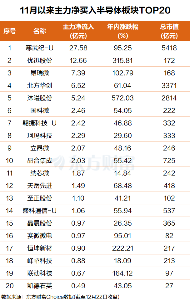 东方财富Choice 数据显示,自今年 11 月以来,主力资金抢筹了一批半导体板块个股,净买额前 20 个股超 81 亿元。