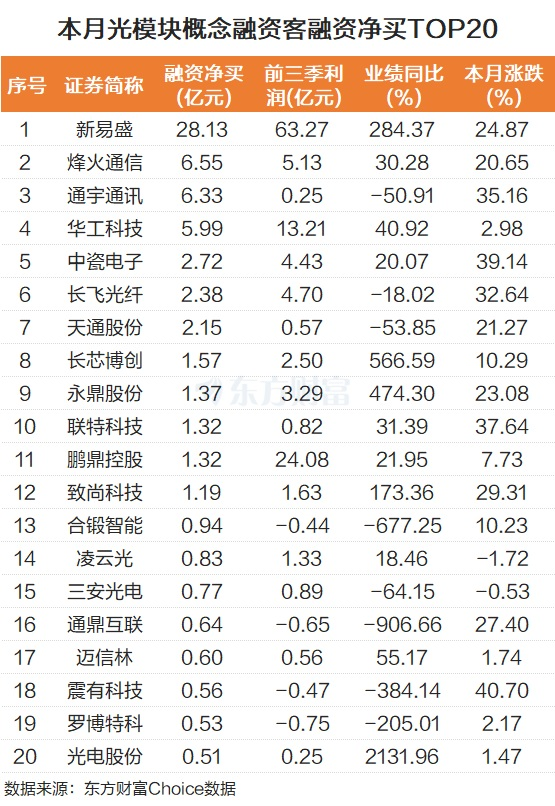 从个股角度来看,本月光模块概念也颇受杠杆资金青睐。东方财富Choice 数据显示,按个股融资净买入额相加,光模块板块本月被融资净流入 44.61 亿元。