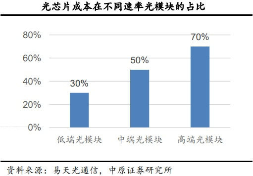 资料显示,光芯片是光模块的核心上游组件,承担光电/电光转换的核心功能,其性能直接决定光模块的速率、功耗与稳定性。中原证券表示,光芯片在不同速率光模块的成本占比通常在 30%-70%,而越高速、越高端的光模块,光芯片的成本占比就越高。