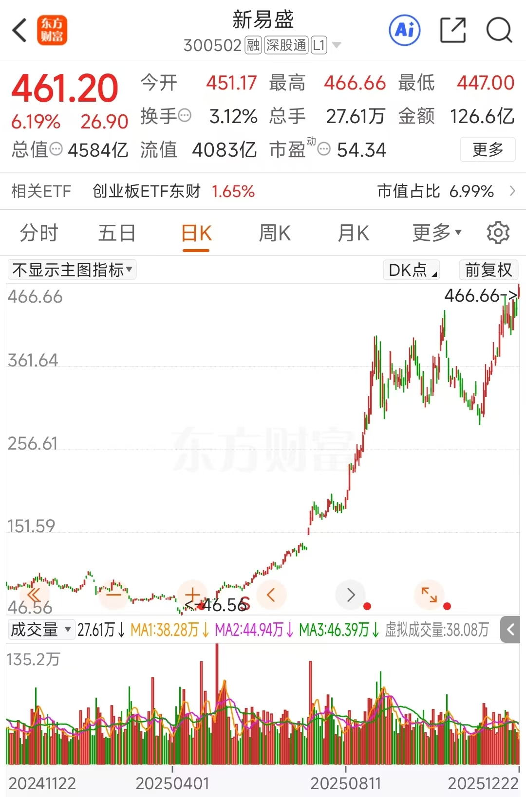 尤其新易盛,早盘一度大涨超 7%,刷出 466.66 元的历史新高价,这和 4 月 9 日盘中触及的 46.56 元相比,年内已完成股价十倍的壮举。