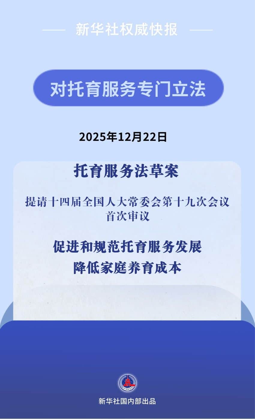 12 月 22 日,托育服务法草案提请十四届全国人大常委会第十九次会议首次审议。草案共 8 章 76 条,包括总则、托育机构、托育人员、服务提供、保障措施、监督管理、法律责任和附则。