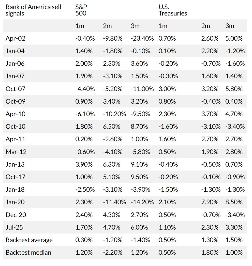 美国银行认为,任何超过 8 的数值都会触发 「抛售信号」。自 2002 年以来的 16 次 「命中」 记录显示,标普 500 指数在随后的三个月内平均下跌 1.4%。而衡量全球股市的 MSCI 所有国家世界指数在三个月内的平均回撤幅度更高达 8.5%,且未来一个月内的最大上涨空间仅为 1.7%。