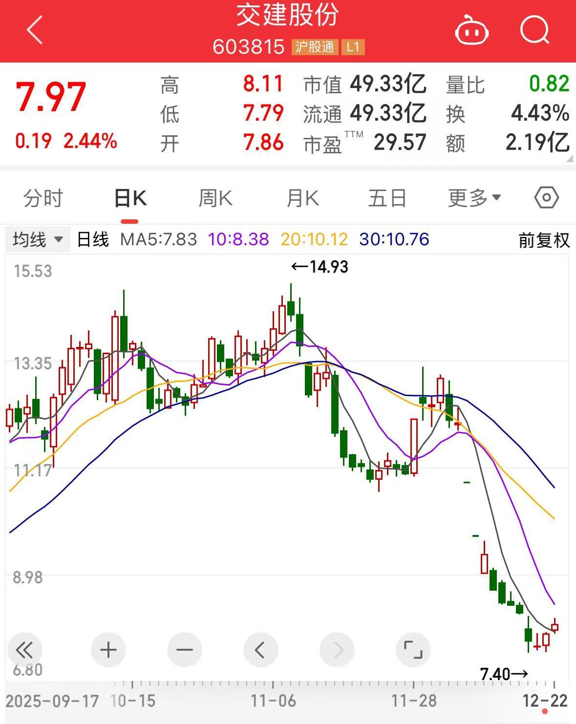盘面上,截至今日收盘,交建股份股价涨 2.44%,报 7.97 元,总市值 49.33 亿元。