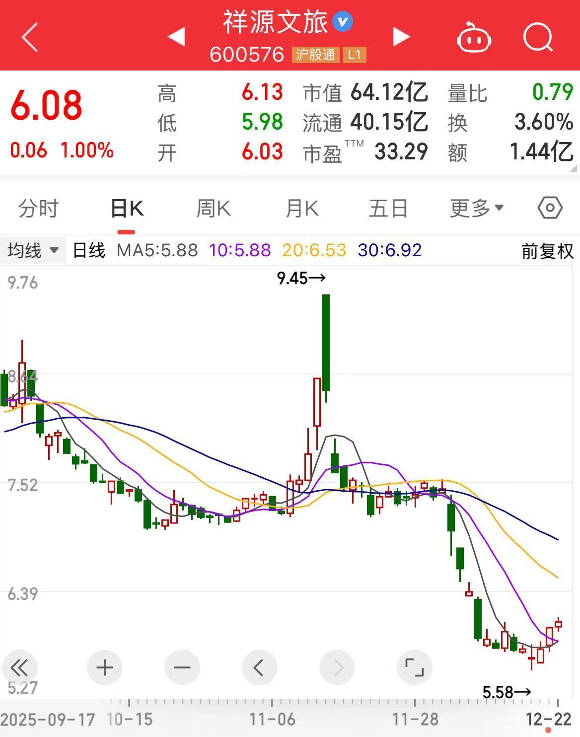 盘面上,截至今日收盘,祥源文旅股价涨 1%,报 6.08 元,总市值 64.12 亿元。