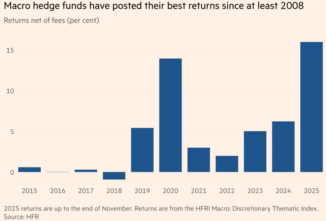 数据提供商 HFR 追踪此类基金回报的指数在 11 月底上涨了 16%,这使得该行业有望创下追溯至 2008 年的数据记录中盈利最多的一年。宏观基金旨在通过交易股票、债券和大宗商品从经济趋势中获利。
