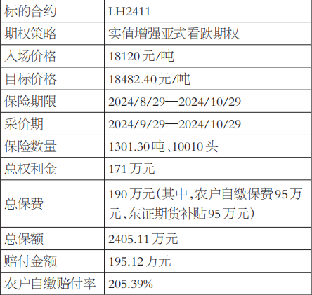 为更好地落实党中央支持藏区发展政策,针对迭部县生猪产业发展特色,2024 年 8 月 29 日,东证期货 「IF 公益」 投入 95 万元在迭部县开展生猪 「保险+期货」 项目,协同风险管理公司东证润和、联合中华财险甘肃分公司,采取增强亚式看跌期权策略,结合更加实用的蒙特卡洛模拟来取代传统的 BS 定价模型,以 Delta(测量标的价格波动对期权价值的影响) 作为主要对冲目标,为迭部县 50 户生猪养殖户提供生猪价格看跌保险产品。保险承保后,随着生猪价格的下跌,养殖户获得了赔付,实现了保障效果。养殖户获得的赔付金额超过自缴保费金额的 2 倍,自缴赔付率为 205.39%,成功通过 「保险+期货」 实现了风险规避。