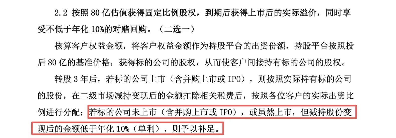 二是持股平台按投后 80 亿元的基准价格,获得上善智能固定比例股权,从而使客户间接持有标的公司的股权,上市后享受实际溢价。该方案还包含隐性兜底条款:若标的公司未上市 (含并购上市或 IPO),或虽然上市,但减持股份变现后的投资收益低于年化 10%(单利),则将予以补足。
