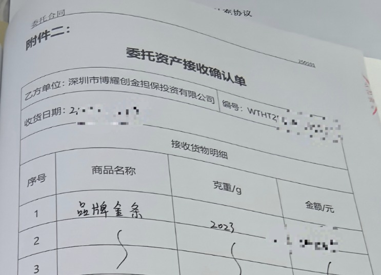 根据陈涛提供的一份合同,流程分为两步。投资者首先与深圳市金雅福首饰有限公司签订 《黄金实物买卖合同》,确立基础买卖关系但不提取实物。随后,再与深圳市博耀创金担保投资有限公司 (下称 「博耀创金」) 签订 《委托合同》,委托其将对应黄金资产用于 「文化金渠道销售」 等业务,而合同中明确的合作方正是深圳市金雅福黄金珠宝发展中心有限公司。