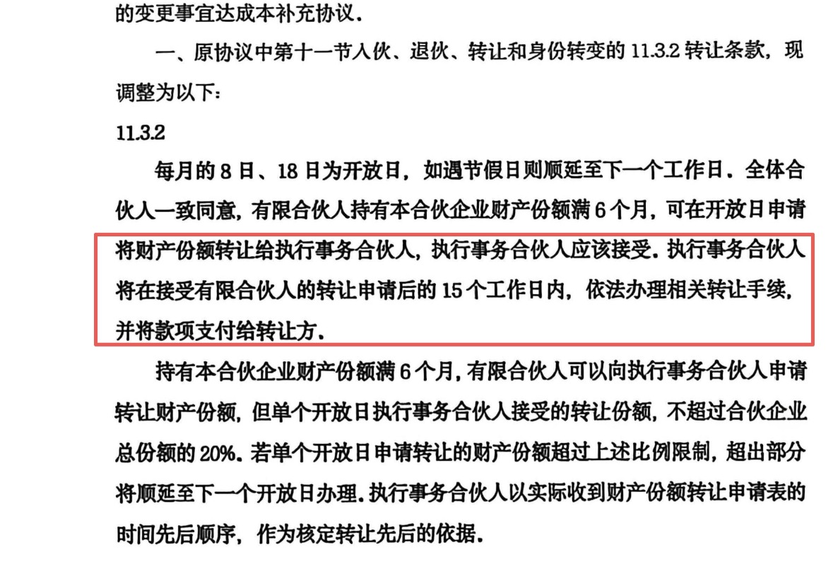 其补充协议进一步明确,有限合伙人持有合伙企业财产份额满 6 个月后,可在开放日要求执行事务合伙人受让其财产份额,后者应在 15 个工作日内办理转让并支付款项。