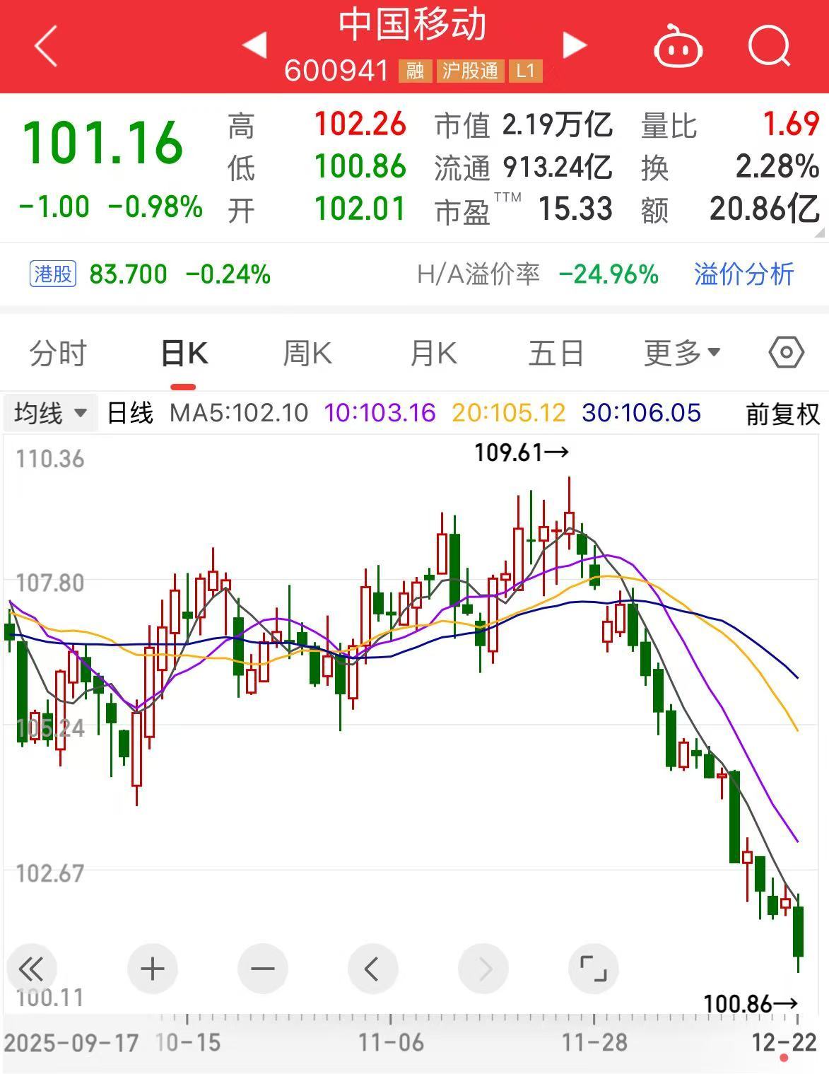 截至 12 月 22 日收盘,中国移动 A 股每股报 101.16 元,总市值约 1.67 万亿元。