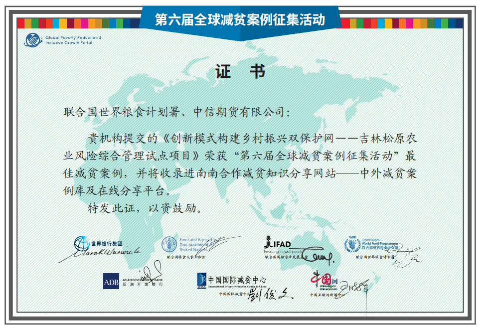 2025 年 12 月 10 日于北京举办的 「2025 全球减贫伙伴研讨会」 上,由中信期货有限公司与联合国世界粮食计划署机构联合实施的 「创新模式构建乡村振兴双保护网—吉林松原农业风险综合管理试点项目」,在全球参选案例中脱颖而出,成功入选第六届减贫案例征集活动 「最佳减贫案例」。该奖项标志着中信期货在推进普惠金融助力乡村农业高质量发展、为乡村振兴和国家粮食安全方面的创新实践获得了国际社会的高度认可,其成功经验将被收录于南南合作减贫知识分享网站——中外减贫案例库及在线分享平台,为全球减贫事业贡献 「中国智慧」 与 「中信方案」。