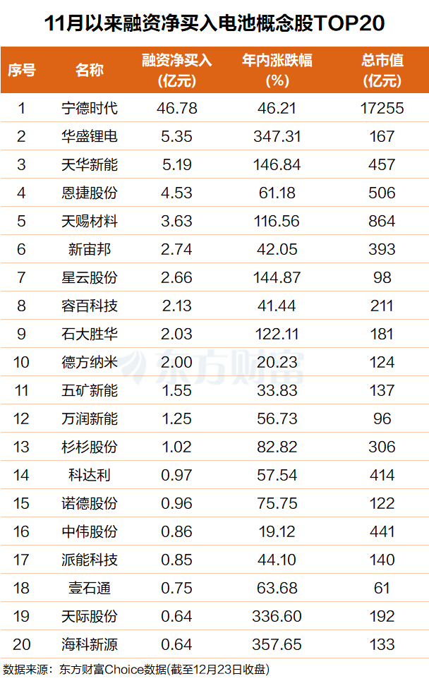 东方财富Choice 数据显示,11 月以来杠杆抢筹了一批电池概念股,金额前 20 个股总计 87 亿元。