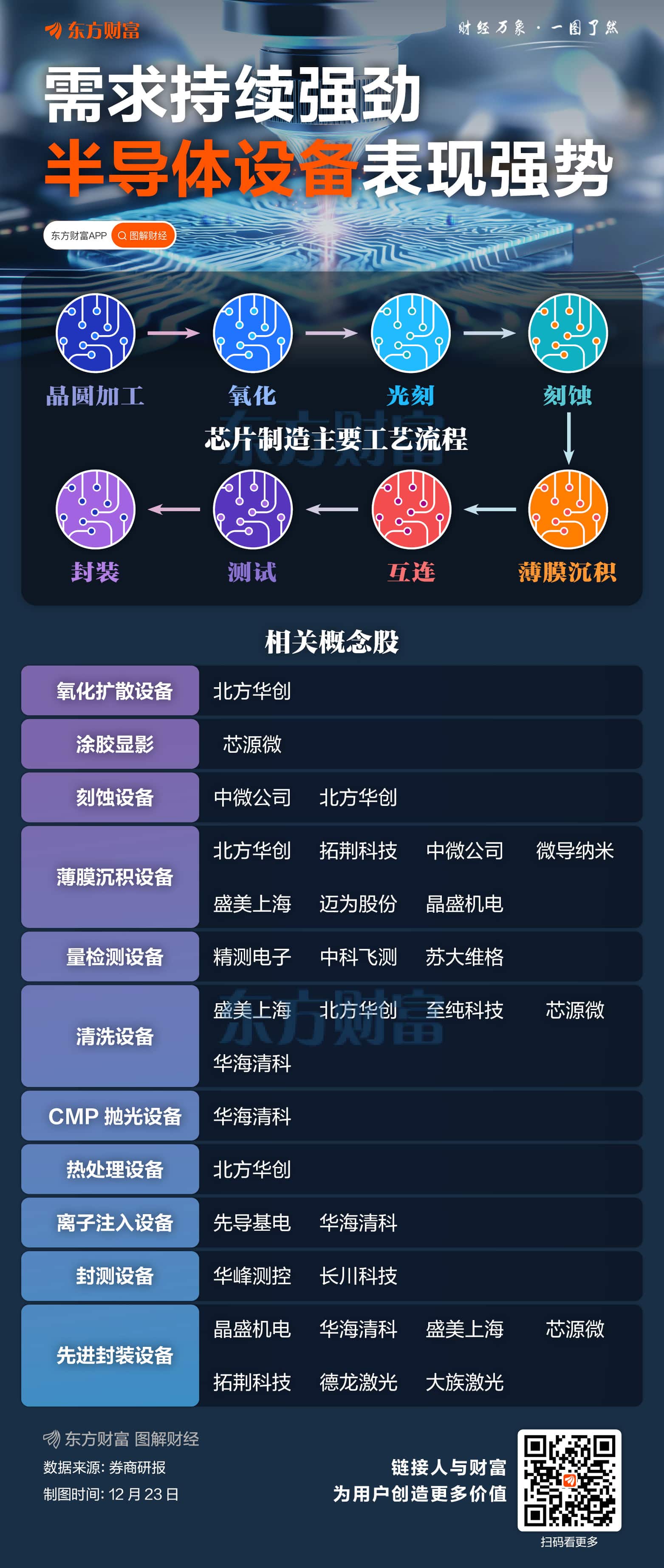 半导体设备 12 月 23 日表现强势,光刻机 (胶) 方向领涨,同飞股份、万润股份、东材科技、国风新材纷纷涨停;珂玛科技、腾景科技、茂莱光学、北方华创、苏大维格等也涨幅靠前。