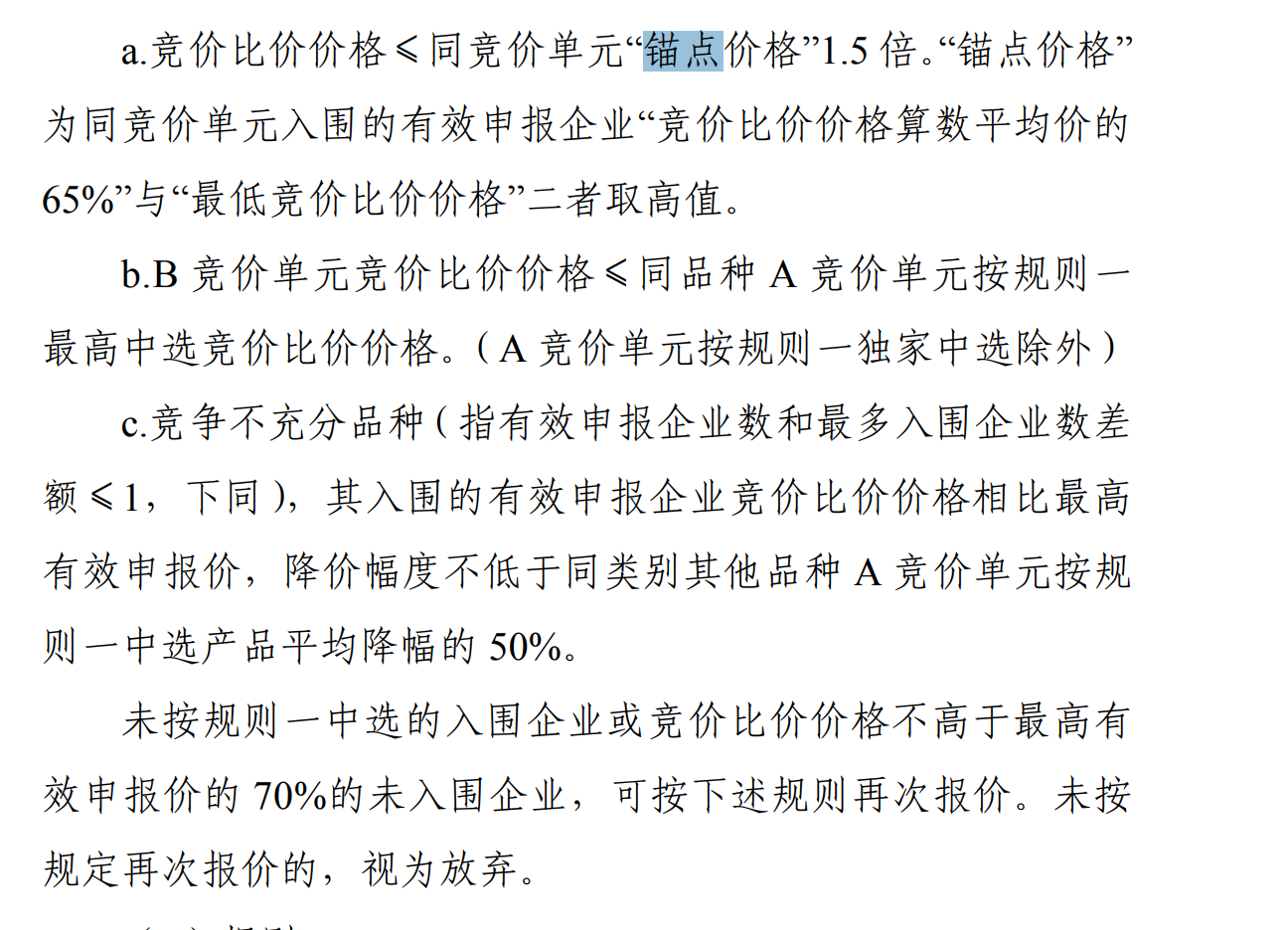 其一,防止出现恶性竞争或者那种自杀式报价把门槛拉得太低。举个例子,假设某企业产品成本是 100 元,但它为了抢标报了 10 元的极低价,那这个价格就成了最低价。如果规则要求其他企业必须报到 10 元以下才能中选,那几乎没人能赚到钱,整个行业都会被拖下水。而一旦引入 「平均价的 65%」 这个锚点,价格就不会被那个极端值带偏,其他企业只要把报价压到这个更合理的水平,就有机会中选,不用盲目跟风拼低价。