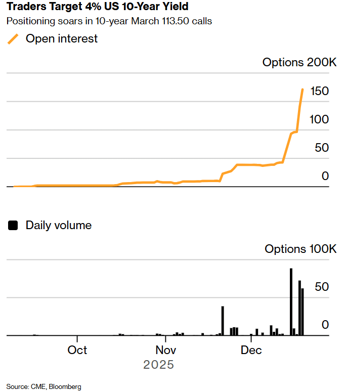 交易员们正大量买入美国国债期权,押注美债即将迎来一波上涨行情,推动美国 10 年期国债收益率在未来几周内回落至 4%。这一收益率水平自 11 月底以来便未再触及。