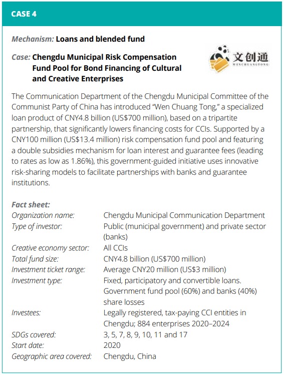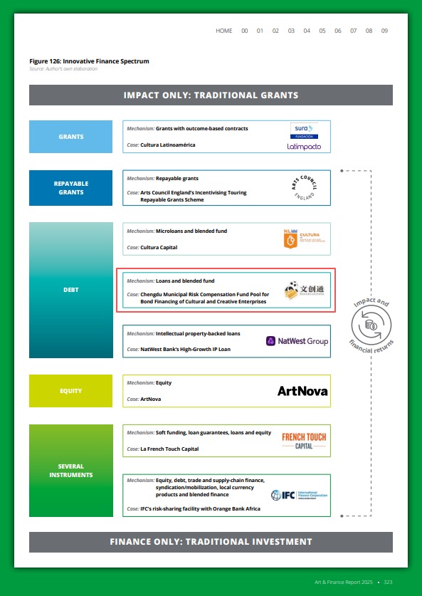 在这份备受行业瞩目的报告中,由中共成都市委宣传部发起、委托每经传媒管理的成都文创金融专属贷款产品——「文创通」 成功入选报告第四部分 「文化创意产业创新金融」 的 「创新金融谱系」,并成为该谱系中亚洲地区入选报告的唯一代表案例。