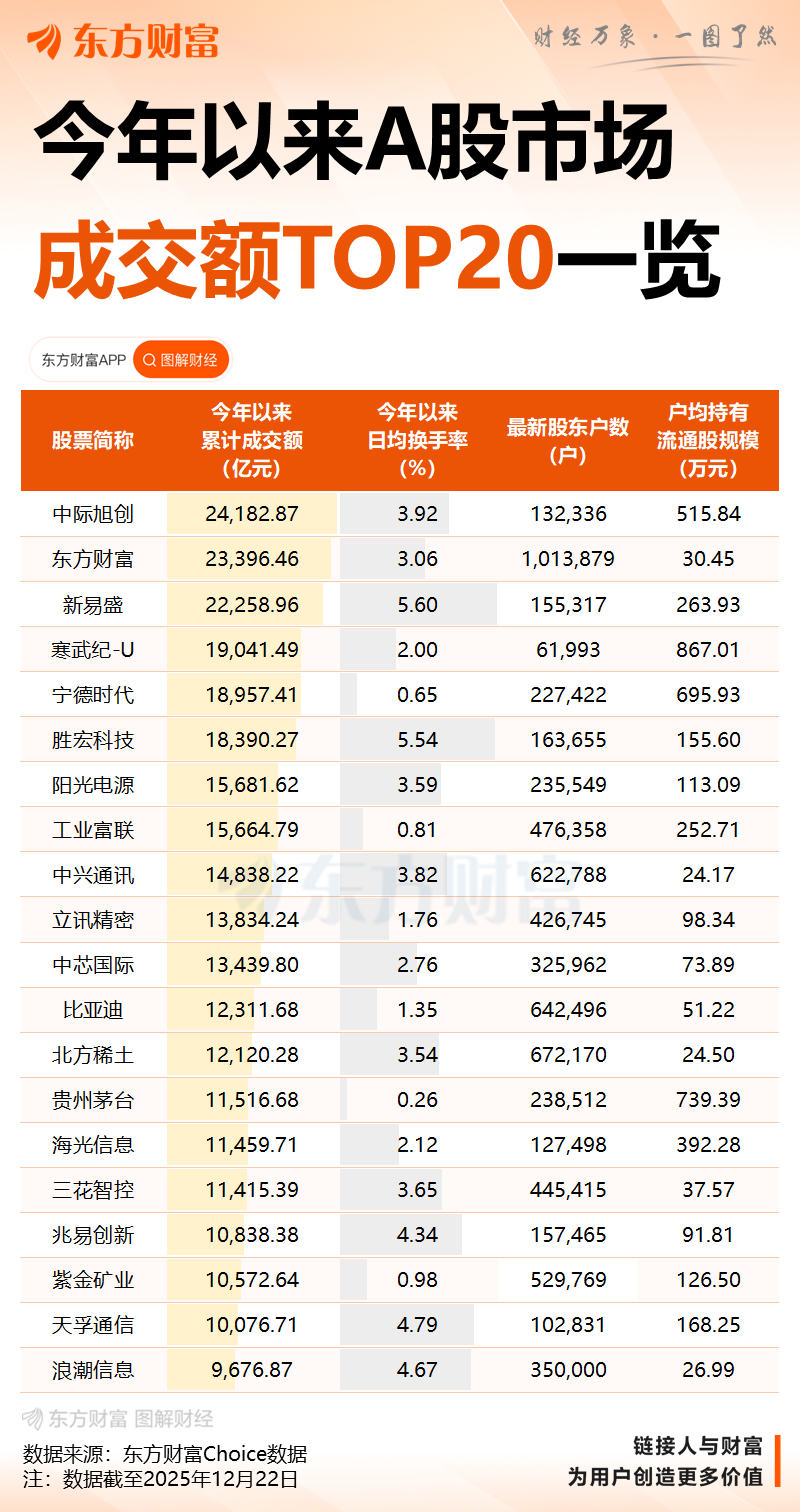 来源: 人民财讯 又是A股新纪录!截至2025年12月22日,A股今年总成交额超过405万亿元,这是A股历史上首次年成交额超过400万亿元。A股整体换手率也明显向好,年内平均换手率接近1.74%,有望创出2016年来新高。 从个股来看,多达19只个股今年成交额超过万亿元,中际旭创、东方财富、新易盛等个股年内成交额均超两万亿元;寒武纪-U、宁德时代、胜宏科技等个股年内成交额均超1.8万亿元。 东财图解·加点干货 (人民财讯) 文章转载自东方财富