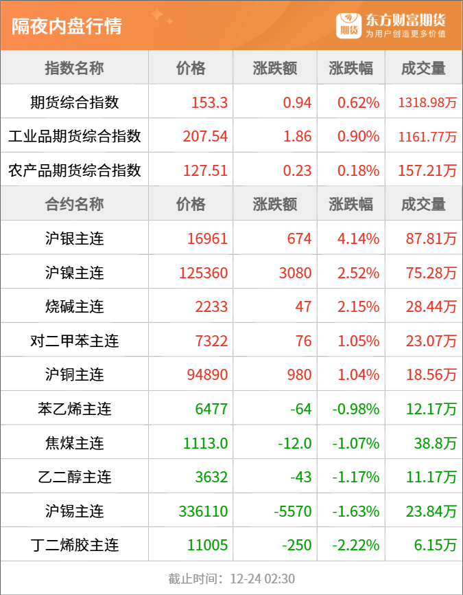 沪铜:北京时间周二 (12 月 23 日) 晚间,连续上涨近 1 个月的伦铜期货突破每吨 12000 美元,这也是该关键工业金属历史首次达到这一整数关口。(财联社)