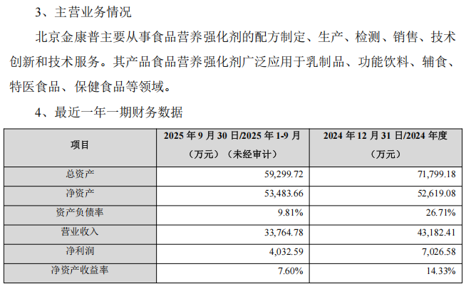 截至 2025 年 9 月 30 日,北京金康普的总资产为 5.93 亿元,净资产为 5.35 亿元。2024 年及 2025 年前三季度,北京金康普的净利润分别为 7026.58 万元、4032.59 万元。