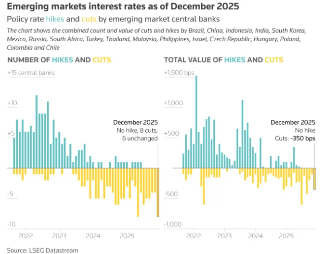 年底的这轮降息浪潮使 2025 年新兴经济体累计降息幅度达 3085 个基点 (共 51 次行动),远超 2024 年的 2160 个基点,创下至少 2021 年疫情以来最大的宽松力度。