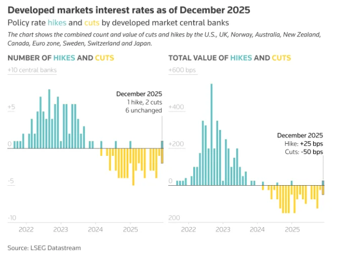 在全球十大最活跃货币的 G10 央行中,有九家在 2025 年下调了基准利率。G10 央行涵盖了美联储、欧洲央行、英国央行、澳洲联储、新西兰联储、加拿大央行、瑞典央行、挪威央行和瑞士央行。