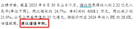 值得注意的是,在诺比侃上市前,有券商在有关诺比侃的申购指南中表示:「公司上市后市值约 35 亿港元,招股价对应 2024 年收入 PE 约 28.0X,估值较高,建议谨慎申购。」