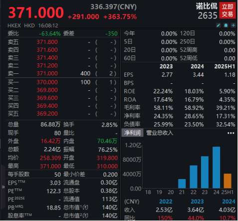 不过,从各方面而言,诺比侃本次上市均只能算是一个小型 IPO,即使在大涨 363.75% 之后,其总市值也不过 140 亿港元。诺比侃本次募资仅约 3 亿港元,所得款净额约为 2.57 亿港元。